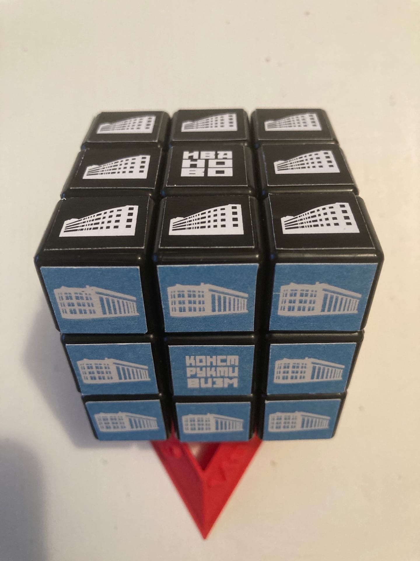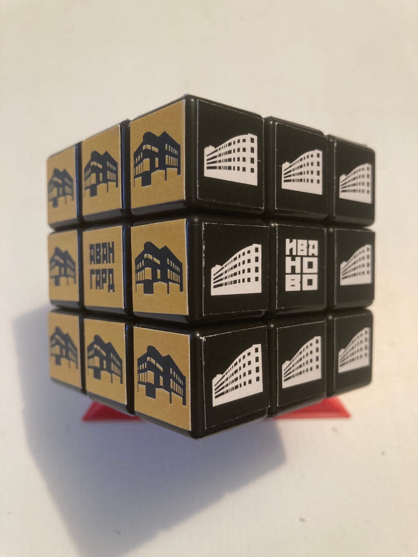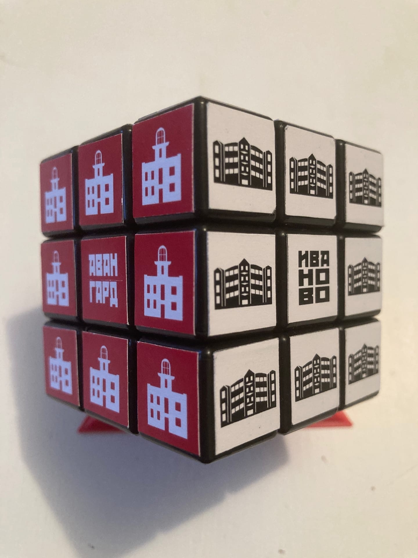 В их числе здания-метафоры: дом-"корабль", дом-"подкова", дом-"птица" и дом-"пуля". Есть силуэты еще двух шедевров конструктивизма - здания железнодорожного вокзала и управления Центробанка. На кубике Рубика есть также надписи "Иваново", "конструктивизм" и "авангард".