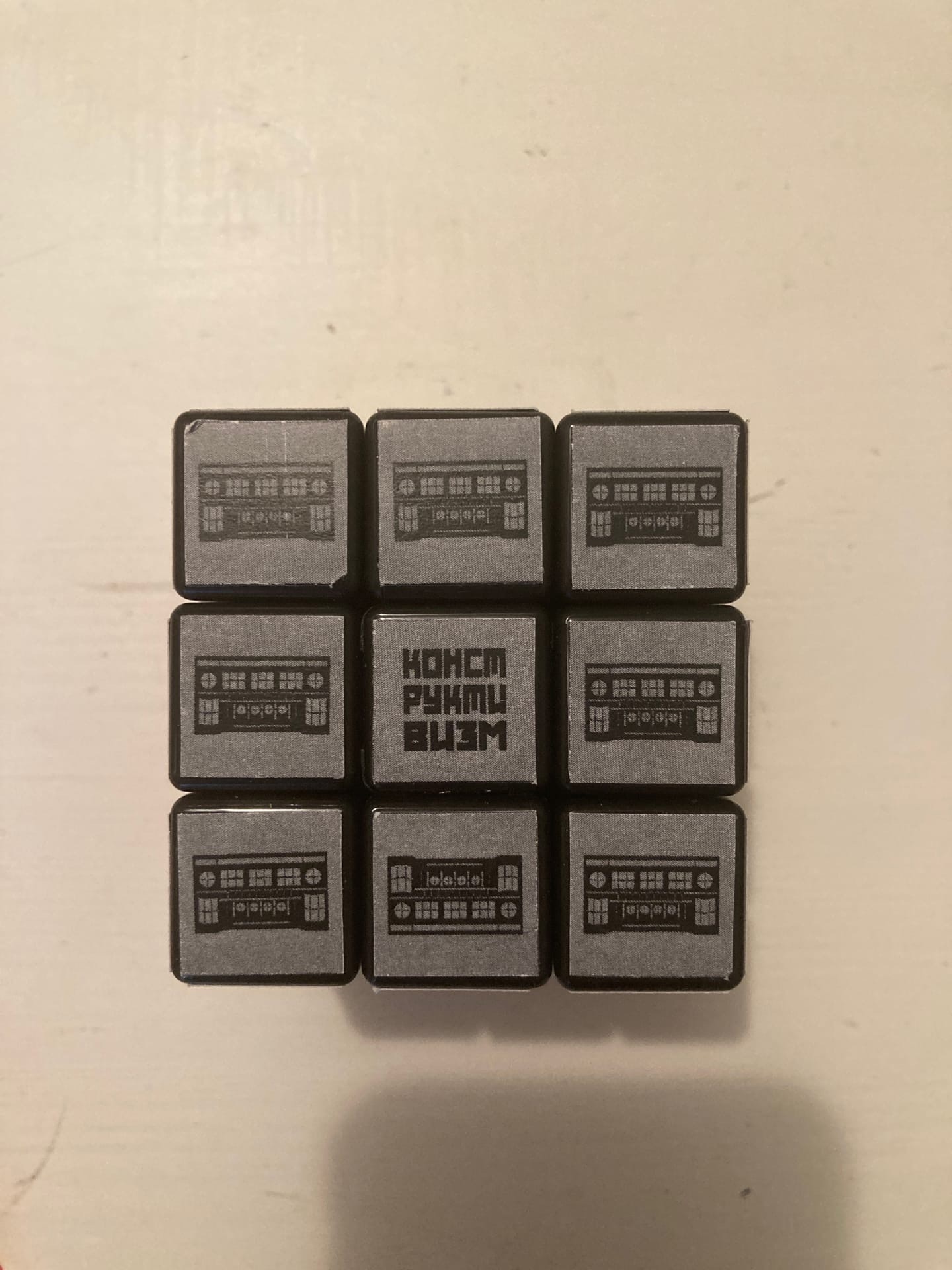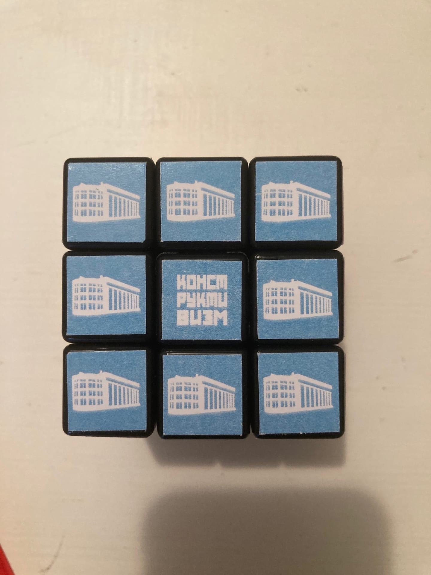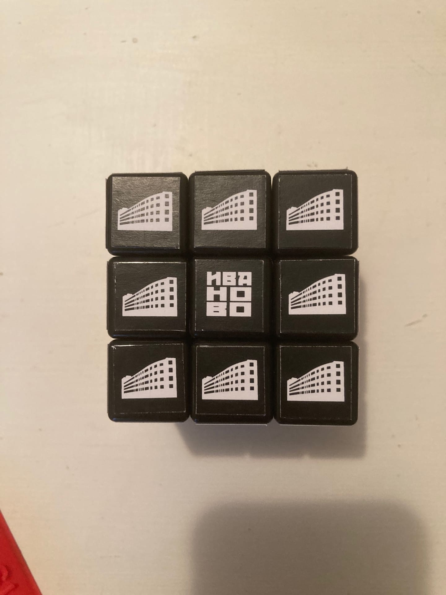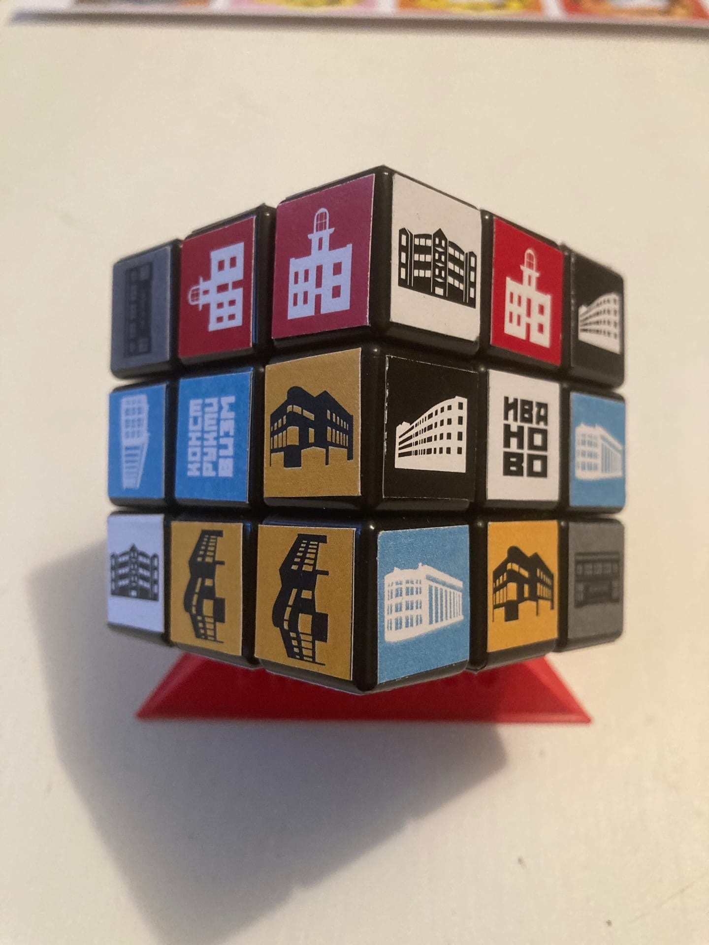 В их числе здания-метафоры: дом-"корабль", дом-"подкова", дом-"птица" и дом-"пуля". Есть силуэты еще двух шедевров конструктивизма - здания железнодорожного вокзала и управления Центробанка. На кубике Рубика есть также надписи "Иваново", "конструктивизм" и "авангард".
