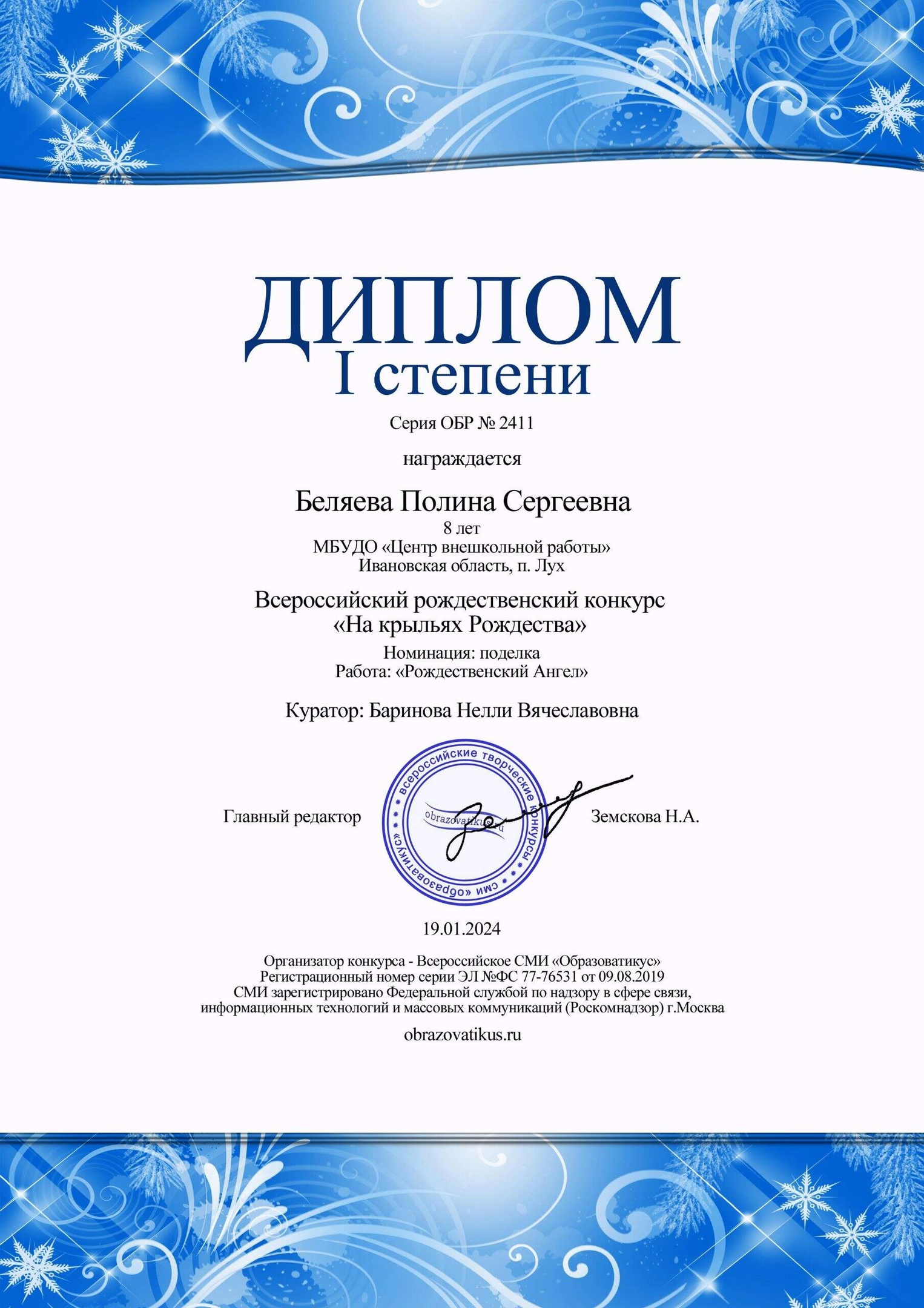 Анна Русина на конкурс "Свет Рождества" представила стихотворение, Полина Беляева на конкурс "На крыльях Рождества" – поделку. Обеих девочек наградили дипломами I степени.