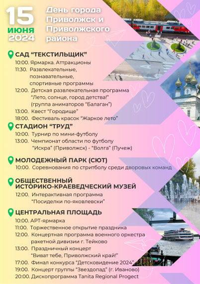В Приволжске отпразднуют День города. Гостей и жителей ждут ярмарки и аттракционы, турнир по мини-футболу, состязания по стритболу и многое другое. Музыкальную составляющую праздника обеспечат военные оркестр Тейковской ракетной дивизии, группа "Звездопад" из Иванова и другие вокалисты.