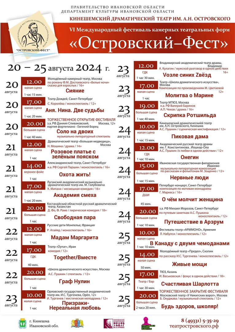 Главной площадкой фестиваля по традиции станет Кинешемский театр имени Островского. Также фестивальные события пройдут в городском доме культуры и музыкальной школе. Свои спектакли представят театры из Москвы, Санкт-Петербурга, Кинешмы, Иванова, Луганска и других городов, а также из Ирана, Армении, Казахстана, Франции и Сербии.
