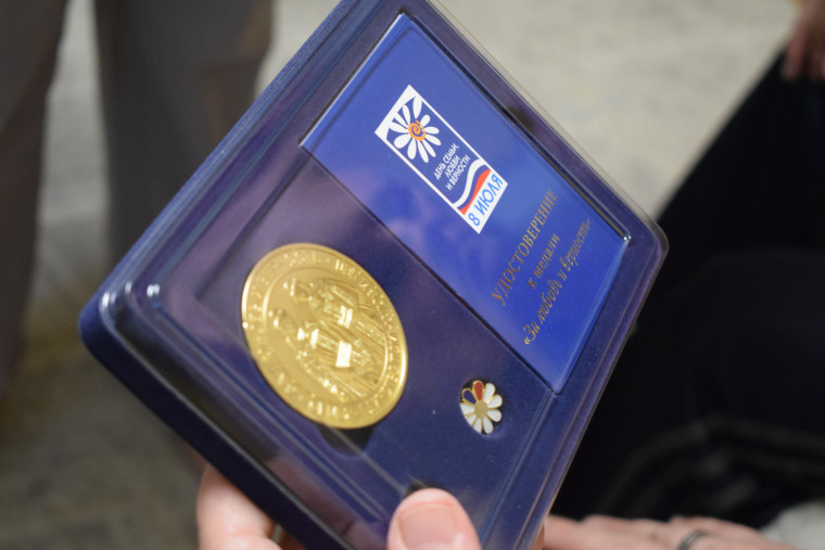 Они вручили Юрию Николаевичу и Татьяне Юрьевне знак в форме ромашки. Именно этот цветок является официальным символом Дня семьи. Вместе с медалью супругам вручили грамоту, а также цветы и подарок от администрации города.