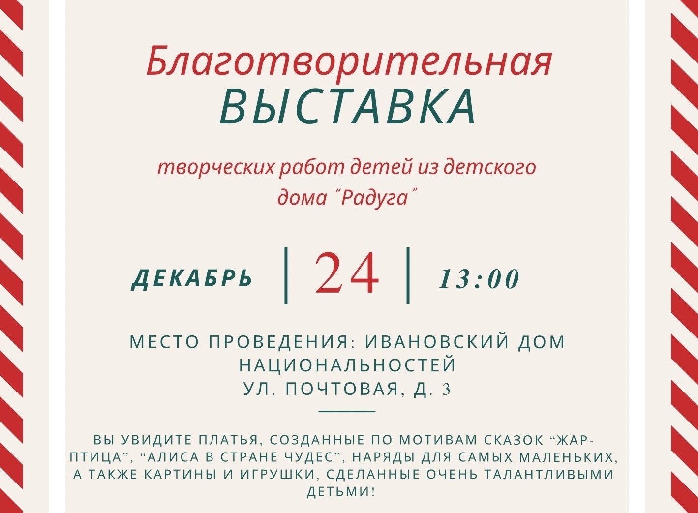 Благотворительная выставка «Подари детям праздник!» пройдет сегодня в Иванове. Каждая представленная работа создана детьми из детского дома «Радуга». Экспозиция будет включать в себя удивительные платья по мотивам сказок, яркие картины и трогательные игрушки.