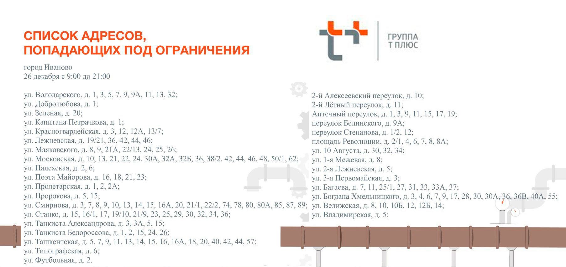 Более 150 домов в Иванове отключат 26 декабря от тепла и горячей воды. Подачу теплоносителя прекратят с 9:00 до 21:00. Это связано с ремонтными работами на сетях на перекрёстке улиц Владимирская и Бубнова. Там обнаружено повреждение магистрали. По словам энергетиков – ремонт необходим для исключения аварий в морозы.