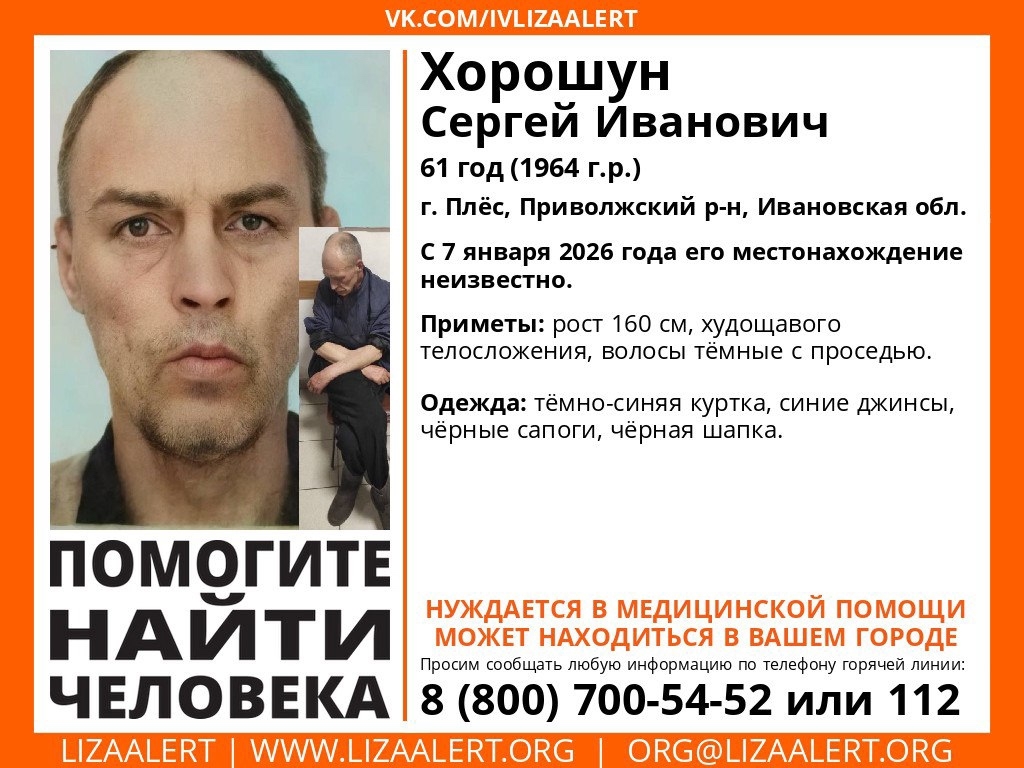 В Ивановской области пропал мужчина 61 года. Местонахождение Хорошуна Сергея из Плёса, Приволжского района, неизвестно с 7 января. Волонтёры отряда «ЛизаАлерт» объявили поиск. Они просят всех, кто владеет информацией о том, где сейчас житель Плёса, сообщить информацию по телефонам 112 или 8-800-700-54-52.