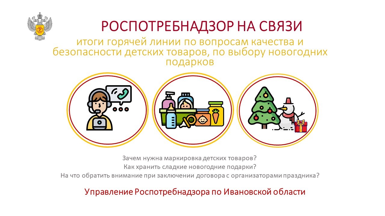 В Ивановской области подвели итоги горячей линии по вопросам качества и безопасности детских товаров и по выбору новогодних подарков. Она была организована в декабре специалистами регионального Управления Роспотребнадзора. Всего на горячую линию поступило более 70 звонков. Наибольшее число вопросов касались качества и безопасности детской обуви, одежды, сладких подарков, организации и проведения праздничных новогодних мероприятий для детей, а также действующих нормативных требований к этой категории товаров. Особое внимание на горячей линии было уделено маркировке детских товаров и правилам их продажи дистанционным способом, условиям хранения сладких подарков, заключению индивидуального или группового договора с организаторами праздника. Всем обратившимся на горячую линию даны подробные разъяснения, отметили в ведомстве.