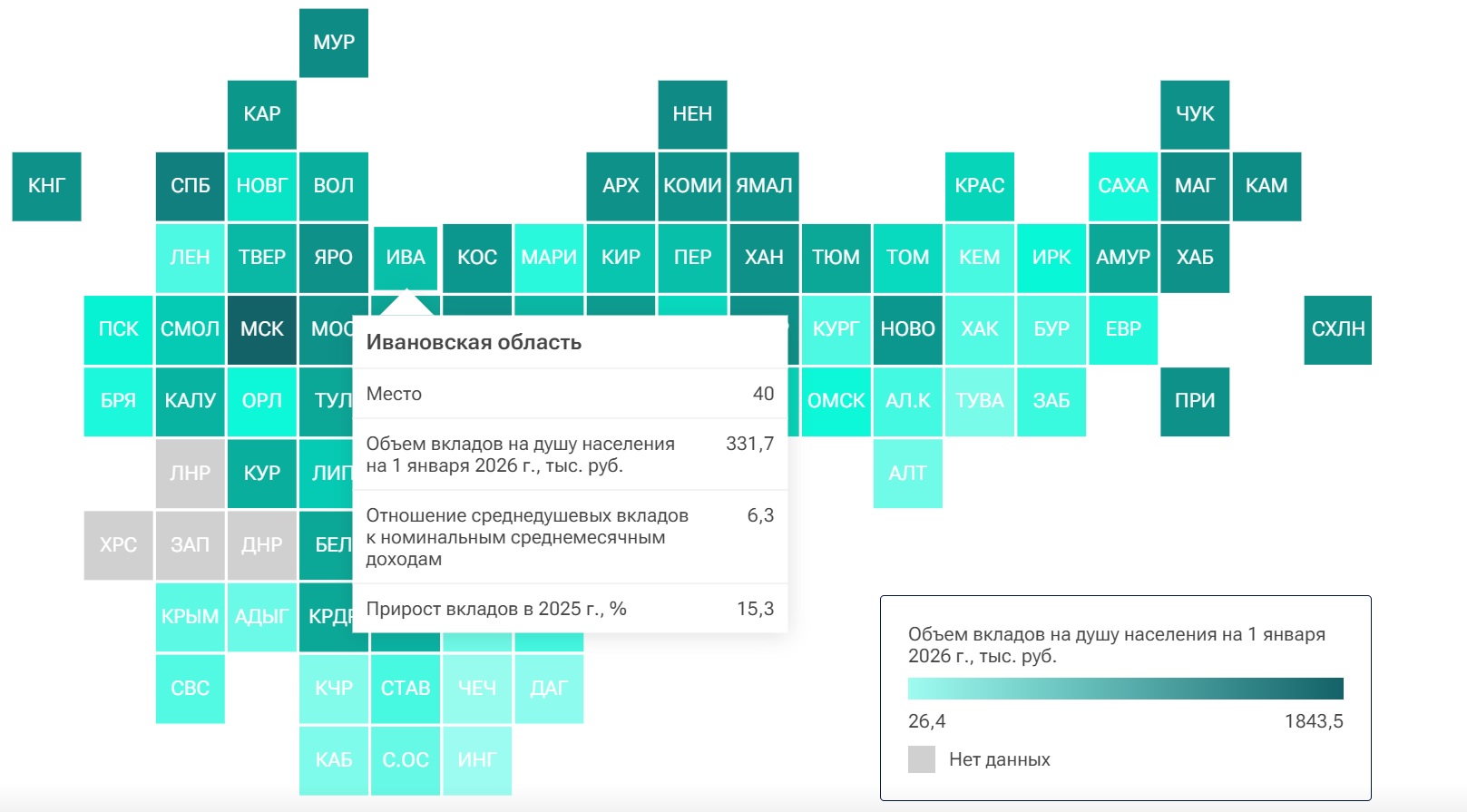 Рейтинг регионов России по вкладам населения составили аналитики РИА. Возглавляют список Москва и Санкт-Петербург, замыкают - Ингушетия и Чечня. Ивановская область – на сороковом месте. Регионы ранжировали по среднедушевому объему вкладов по состоянию на 1 января. Так, средний объем вкладов на одного жителя между регионами лидером и аутсайдером отличается почти в 70 раз. В первую десятку рейтинга помимо двух столиц входят северные регионы - Магаданская область, Чукотский и Ханты-Мансийский автономные округа. Там на вкладах населения - от пятисот тысяч до полутора миллионов рублей и больше. Наименьший объем средств на депозитах в республиках Северного Кавказа - в среднем от 25 тысяч рублей. Прирост вкладов в 2025 году в целом по России составил 14,5%. В Ивановской области – 15,3%.