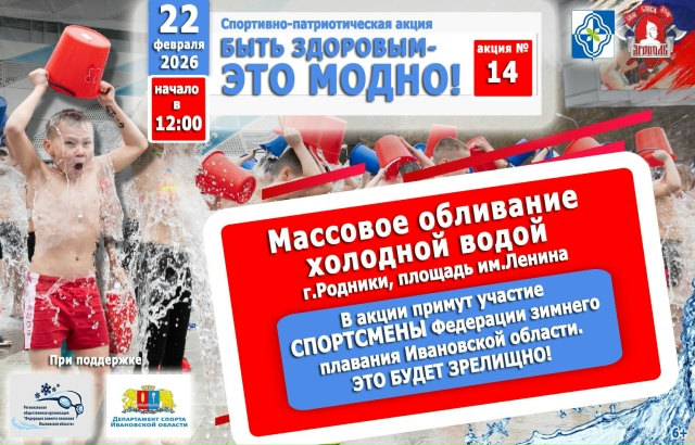 Массовое обливание холодной водой организуют на центральной площади в Родниках. Акция организована спортивно-патриотическим клубом «Ярополк» совместно с Департаментом спорта региона и местной администрацией. Как заявляют организаторы, мероприятие данного формата впервые пройдет в Ивановской области. Акция «Быть здоровым – это модно» пройдет на площади им. Ленина 22 февраля в 12:00 в рамках празднования Широкой Масленицы. Участие в ней примут спортсмены федерации зимнего плавания Ивановской области.