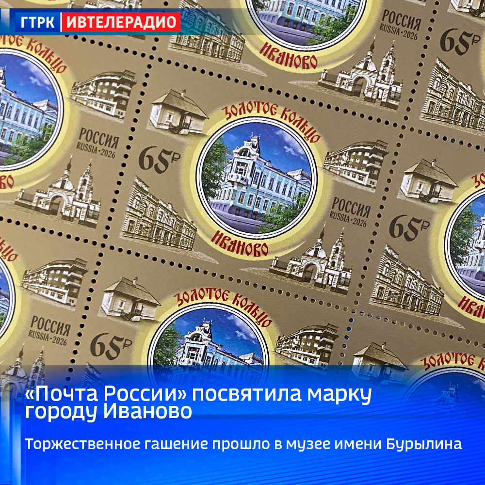 «Почта России» в серии «Города Золотого кольца» выпустила марку, посвященную Иванову. Её торжественное гашение прошло в музее имени Бурылина. Специально для этого события изготовили уникальный штемпель. Его оттиск был поставлен на пяти конвертах с маркой. После этой процедуры они приобретают большую ценность среди коллекционеров. Марка, посвященная Иванову, золотого цвета. На ней изображены музей ситца, Щудровская палатка, дом-корабль, художественный музей и музей Бурылина. В этом году в маршрут «Золотого кольца» вошли 49 населенных пунктов. Восемь из Ивановской области. Среди них Гаврилов Посад, Шуя, Холуй, Южа и Юрьевец.