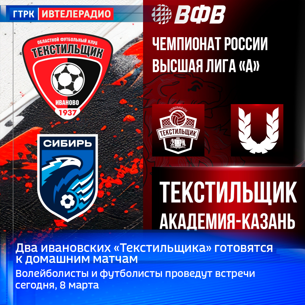 8 марта - не только женский и весенний, но и спортивный праздник. В этот день в Иванове свой первый домашний матч в этом году сыграют футболисты «Текстильщика». Они продолжают сезон во Второй лиге первенства страны. На своем поле будут принимать «Сибирь» из Новосибирска. Матч начнется в 14 часов. А в 16:00 эстафету у футболистов подхватят волейболисты «Текстильщика». Во Дворце спорта они сыграют с «Академией» из Казани. Это будет ответная встреча. Накануне в пером матче волейболисты одолели соперников со счетом 3:0.