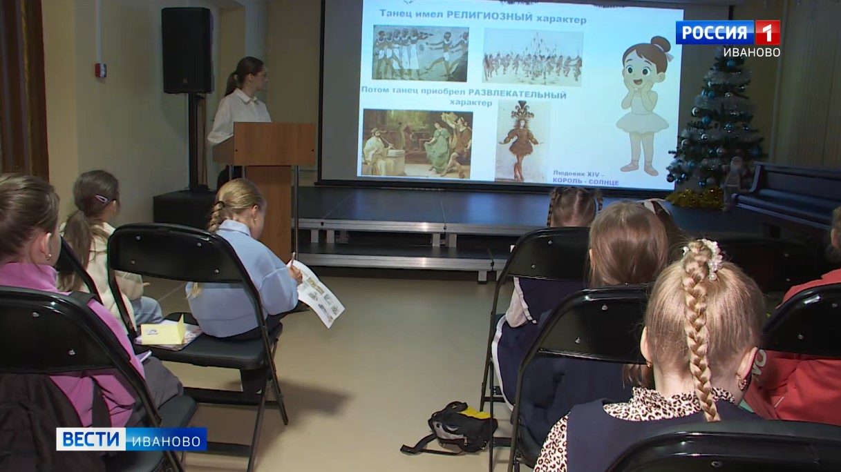 Будущий педагог-хореограф и студентка Ивановского госуниверситета Валерия Калинская представляет свою презентацию по истории танца. От Древней Греции до наших дней. Выступает перед юными танцовщицами - воспитанницами детской школы искусств. И это часть экзамена.